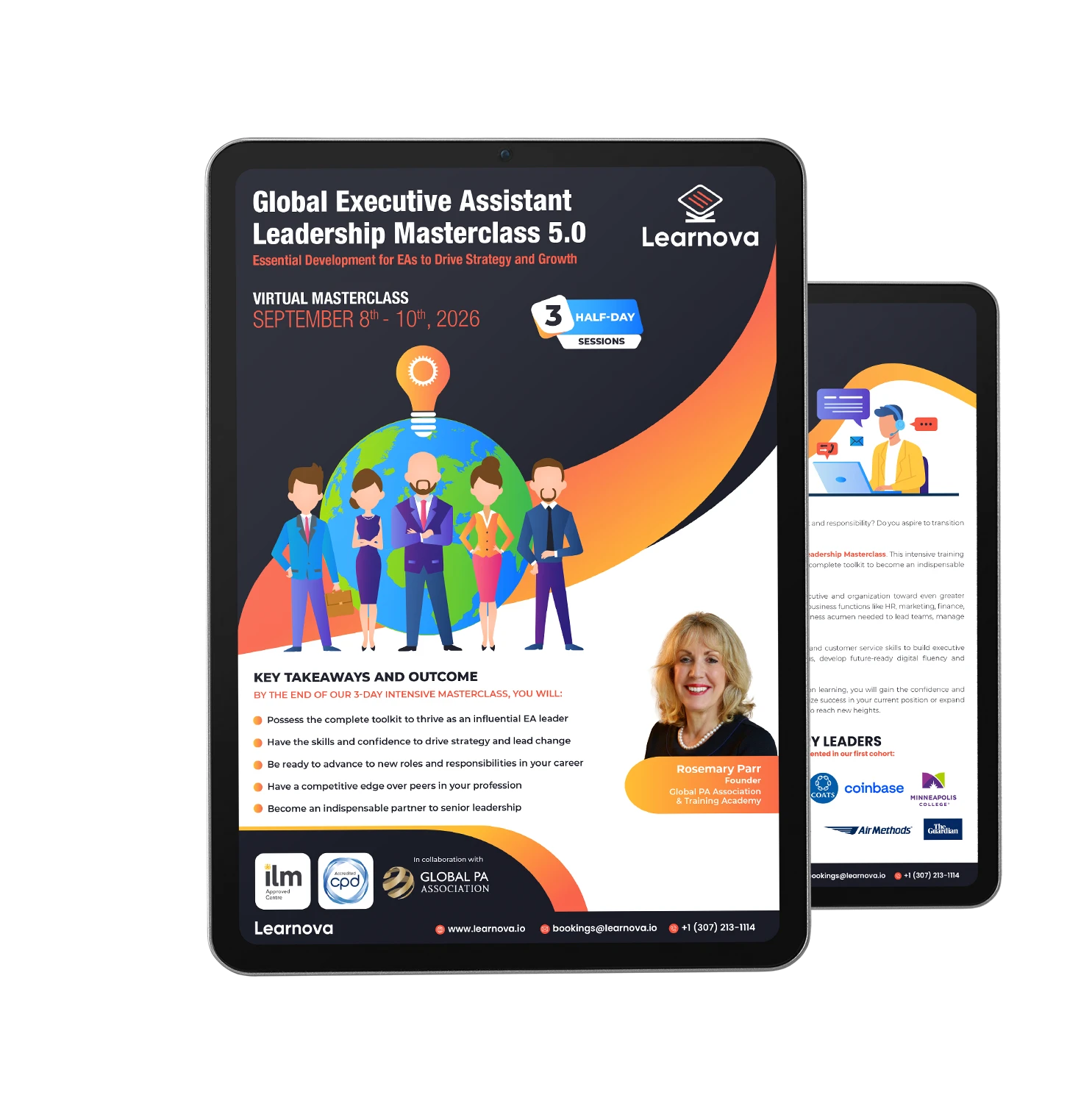 Look no further than our 3 half-day Global Executive Assistant Leadership 5.0 Masterclass. The 5th edition of this training program is specifically designed to equip ambitious EAs with the complete toolkit to become an indispensable advisor and leader.